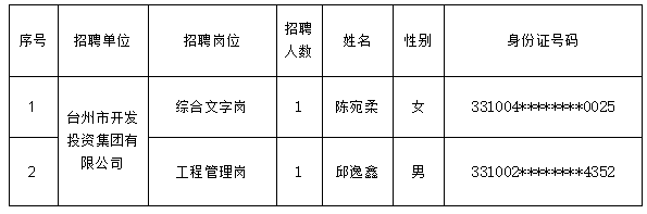 根据《2025年台州市属国企联合招聘(第二批)台州市开发投资集团有限公司招聘公告》(2025.10.24)要求,经公开报名、资格初审、笔试、资格复审、面试、体检和考察等程序,确定以下2人为拟录用人员,现将相关事项公示如下: